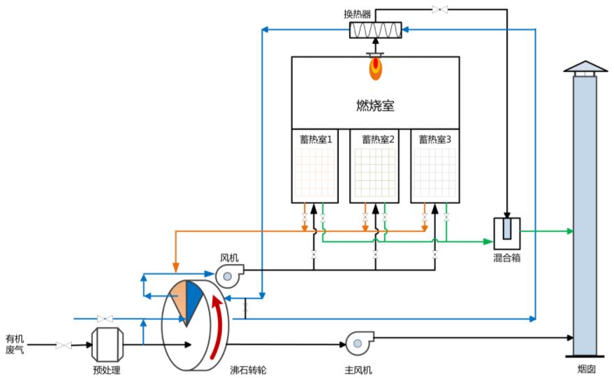 廢氣流經蓄熱室1升溫后進入氧化室氧化,凈化后的高溫氣體離開氧化室,進入蓄熱室2,釋放熱量,降溫排出,而蓄熱室2吸收大量熱量后升溫,同時清掃蓄熱室3。循環完成后,進氣與出氣閥門進行一次切換,進入下一個循環,廢氣由蓄熱室2進入,蓄熱室3排出,清掃蓄熱室1。如此交替。由于廢氣已在蓄熱室內預熱,燃料耗量大為減少,運行成本大大降低。