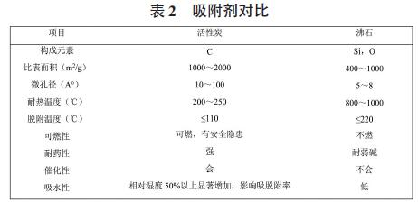氣體吸附分離成功與否,極大程度上依賴于吸附劑的性能,因此選擇吸附劑是確定吸附操作的首要問題。工業上常用的吸附劑有:硅膠、活性炭、活性氧化鋁、分子篩等,其中活性炭是應用最廣泛的吸附劑,沸石材料是一種安全高效吸脫附材料,兩者吸附特性對比情況見表2。