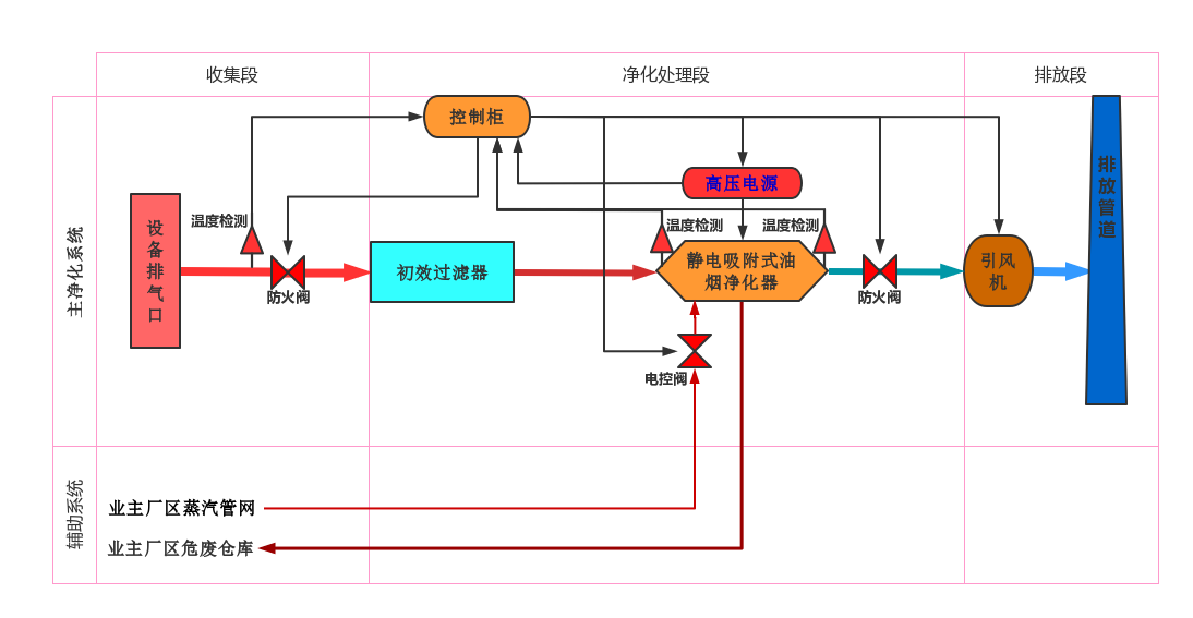 化纖車間作業廢氣,由設備排氣口接入廢氣收集管道,順不銹鋼管道進入初效過濾器,先經不銹鋼絲網初效過濾器濾除廢氣中的灰塵、纖維類顆粒物后,通過管道接入靜電吸附式油煙凈化器,經凈化器內高壓電場作用,油煙中油霧顆粒被電場陽極捕捉,順陽極滴落在集油盤中,由排油口排出至廢油收集桶。經油煙凈化器凈化后的氣體,經引風機送入排放煙囪對空15米達標排放。