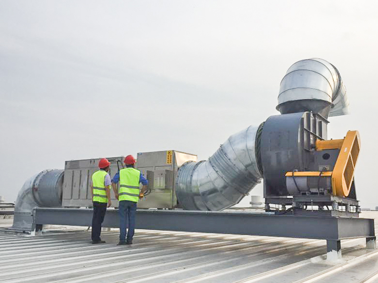 本項目是對紡織行業化纖車間生產過程中產生的廢氣進行收集減排處理,化纖車間作業時產生的約35000m3/h的有機廢氣,主要污染物:油霧(非甲烷總烴)≤120mg/m3。本次鑫藍環保采用1套35000CMH的初效過濾+板式靜電吸附油煙凈化的組合凈化工藝對本項目化纖車間廢氣處理,凈化后的潔凈氣體經引風機送入排放煙囪對空達標排放。