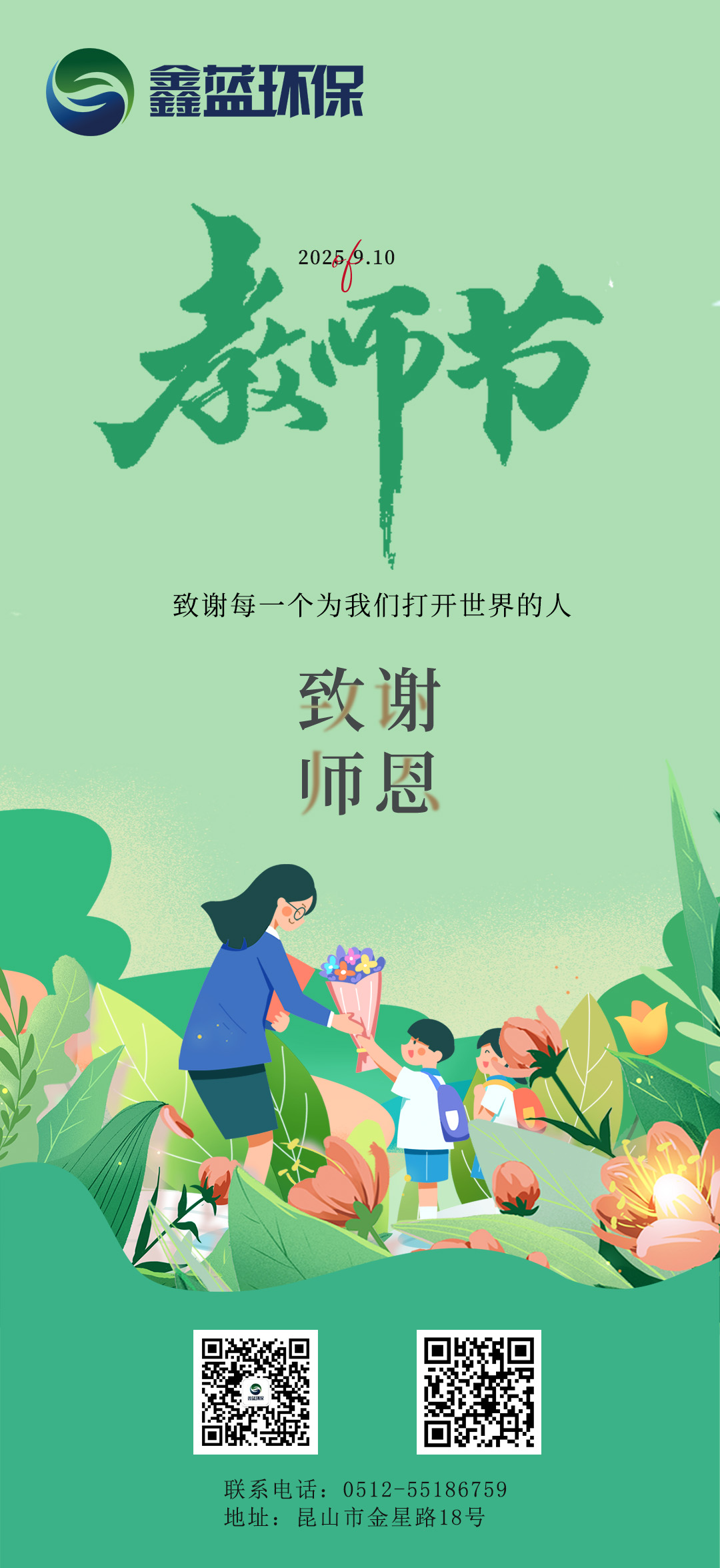 金秋九月,桃李芬芳。在第三十八個教師節來臨之際,鑫藍環保科技(昆山)有限公司以“感恩師道 綠意傳承”為主題,向全體教育工作者致以崇高的敬意與深情的祝福。作為深耕環保科技領域的創新型企業,我們始終堅信:教育是培育綠色未來的根基,而教師則是點亮生態文明的火炬手。
