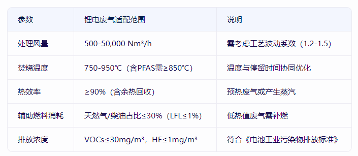 通過燃氣/燃油輔助燃燒,將廢氣加熱至750-950℃(根據成分調整),使有機物(如NMP、電解液)分解為CO?和H?O。