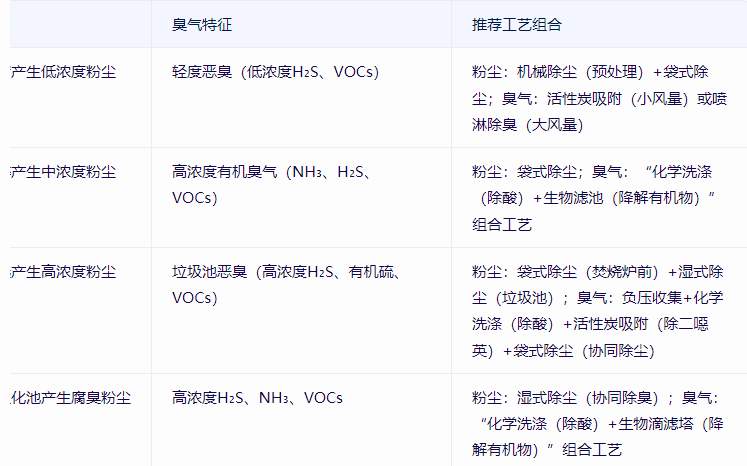 垃圾處理場景(轉運站、堆肥廠、焚燒廠)的粉塵與臭氣特征差異大,工藝需針對性匹配: