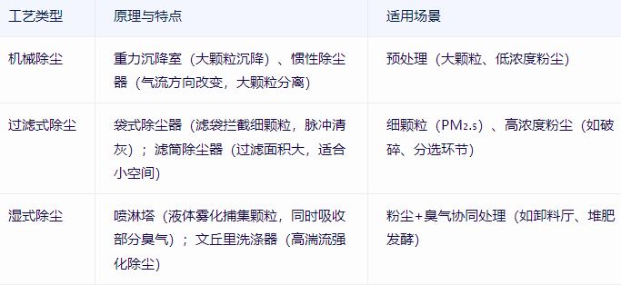 總結:垃圾處理中,粉塵以袋式除塵為主,臭氣優先生物法(連續場景)或組合工藝(復雜成分),場景化匹配是關鍵,同時兼顧排放合規與成本控制。