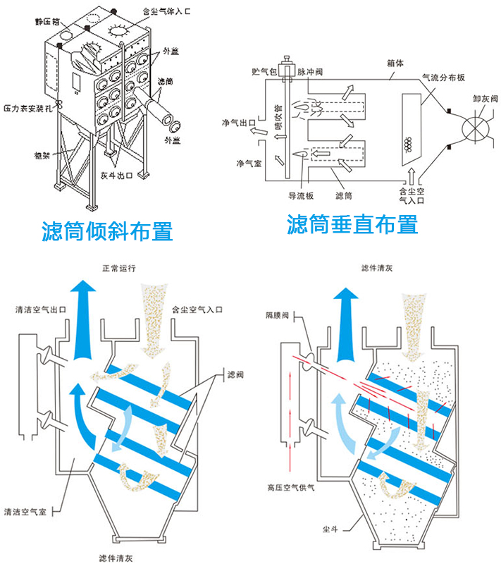 濾筒除塵器主要是由進(jìn)風(fēng)管、灰斗、箱體、清灰裝置、導(dǎo)流裝置、濾筒、氣流分布板及電控裝置組成的。下部是過濾室,上部是氣箱脈沖室。在濾筒除塵器入口的位置裝有氣流分布板。濾筒可以垂直布置在箱體花板上,也可以傾斜的布置在花板上。從清灰的效果上看,垂直方向的布置得比較適當(dāng)。鑫藍(lán)環(huán)保的濾筒除塵器被普遍地應(yīng)用在鋼鐵、食品、冶金、化工、打磨等工業(yè)區(qū)域中。