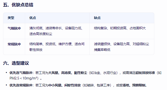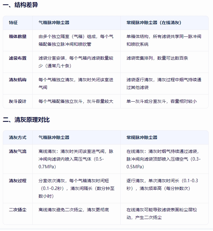 氣箱脈沖除塵器和常規(guī)脈沖除塵器(通常指在線清灰脈沖除塵器)在結構、清灰原理、性能特點及應用場景等方面存在顯著差異,以下是具體對比:
