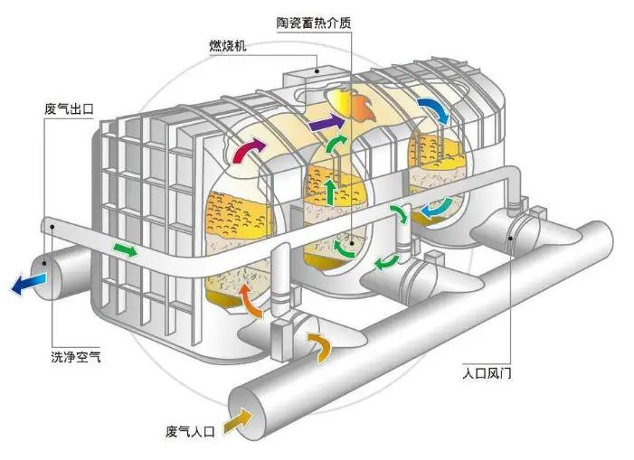 主要由上腔、下腔、氣閥、加熱系統(tǒng)、風(fēng)機(jī)、超溫泄放裝置等組成。陶瓷換熱填料的熱特性可用于從熱氣體(燃燒處理后的凈化氣體)中迅速吸收熱量,用于加熱冷空氣。可與熱風(fēng)或寒氣交替接觸,降低燃料消耗,節(jié)約能源。RTO設(shè)備中有3個(gè)再生器。通過(guò)下腔室開(kāi)關(guān)閥的作用,使上腔室的3臺(tái)再生器依次進(jìn)入進(jìn)、出口加熱、清洗凈化、排余熱儲(chǔ)存的狀態(tài),反復(fù)連續(xù)工作。