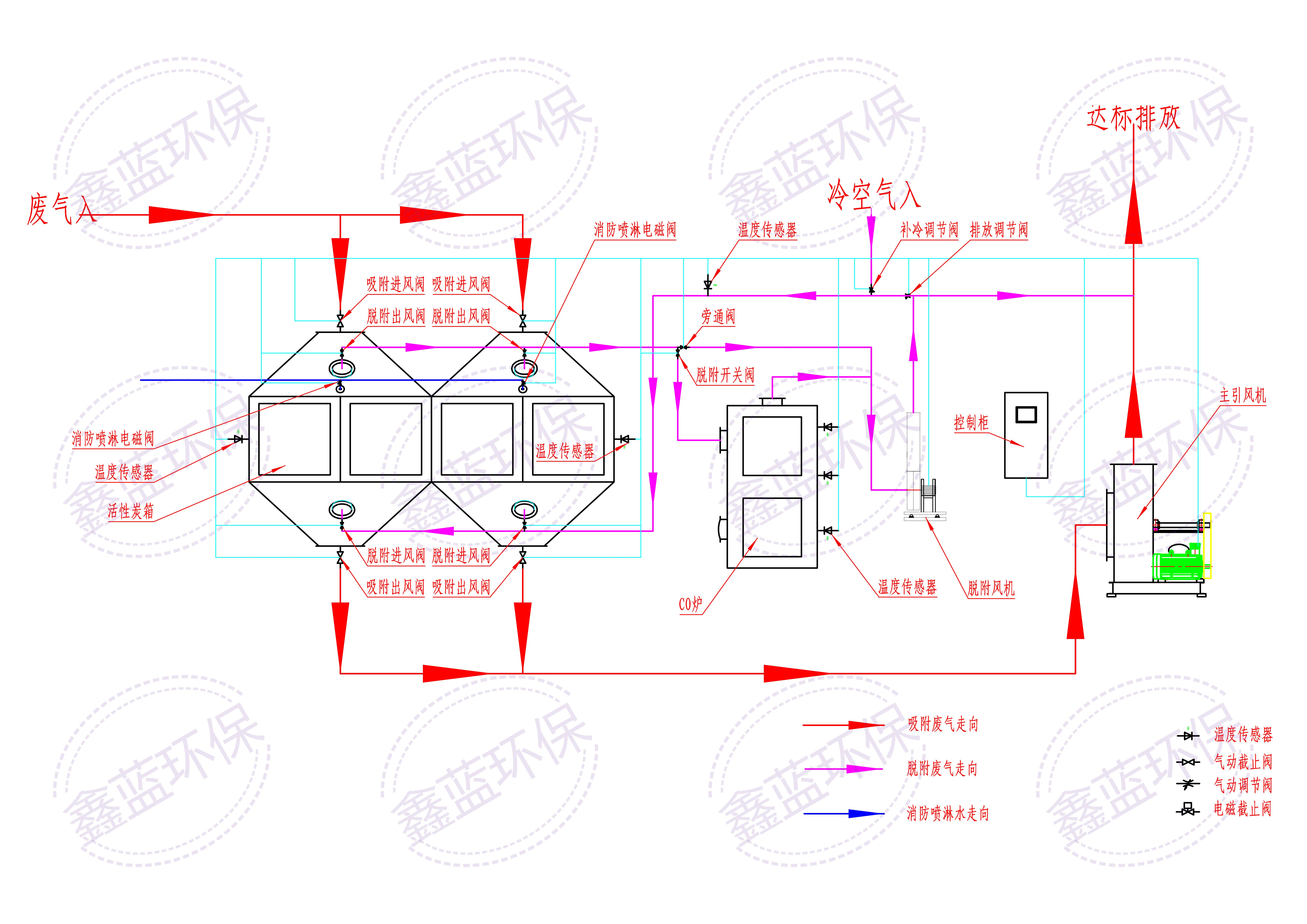 當有機廢氣的流量大、濃度低、溫度低、采用催化燃燒需消耗大量的燃料時,可先采用吸附手段將有機廢氣吸附于吸附劑上并進行濃縮,然后通過熱空氣吹掃,使有機廢氣脫附成為高濃度有機廢氣(可濃縮10倍以上)后再進行催化燃燒。不需要補充熱源就可以維持正常運行。